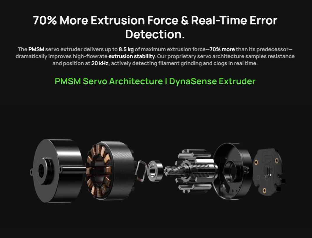Motor servo PMSM con control de bucle cerrado a 20 kHz, que asegura flujo uniforme y estable incluso con filamentos complejos. - Tecnología opcional Vision Encoder